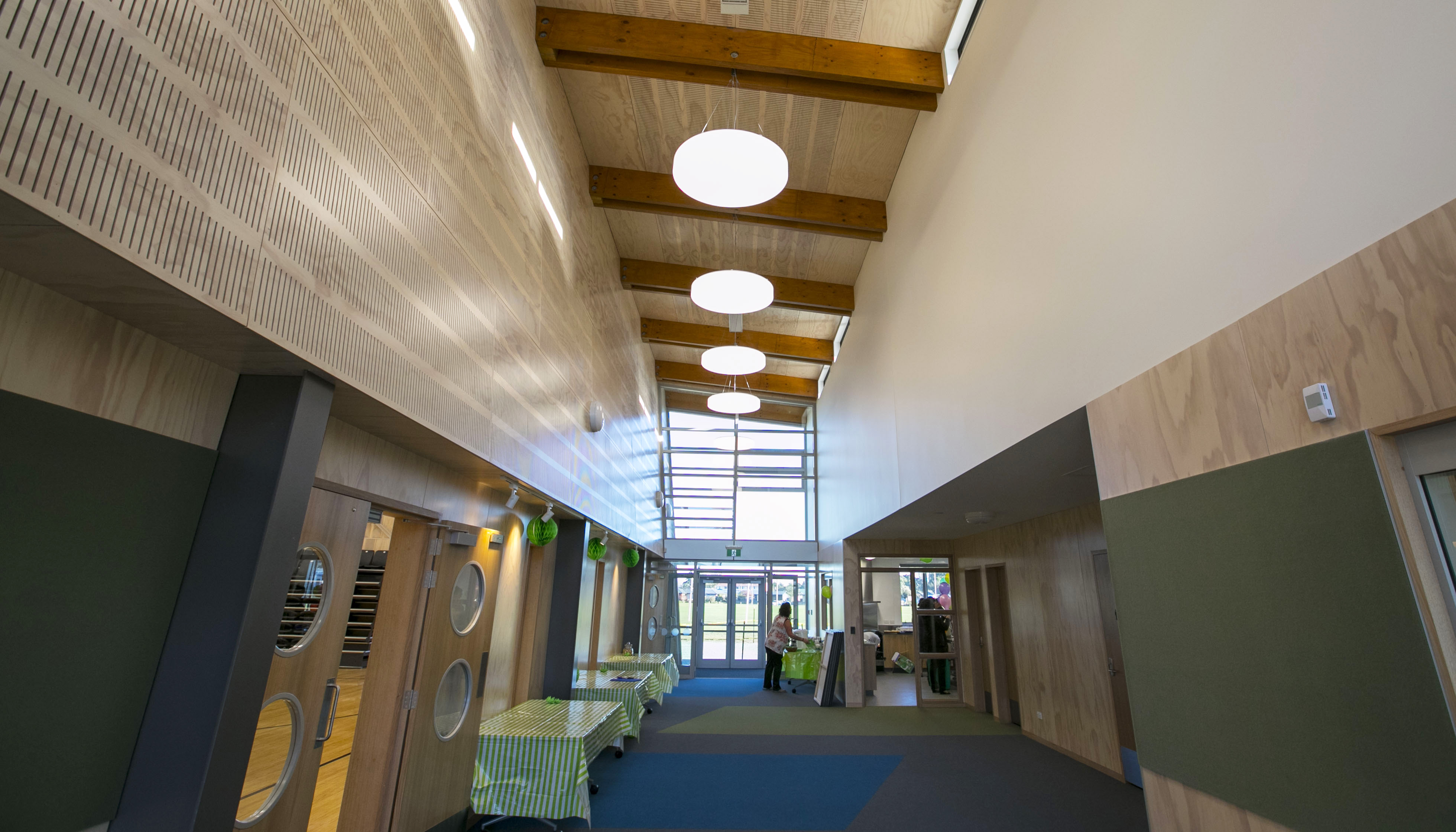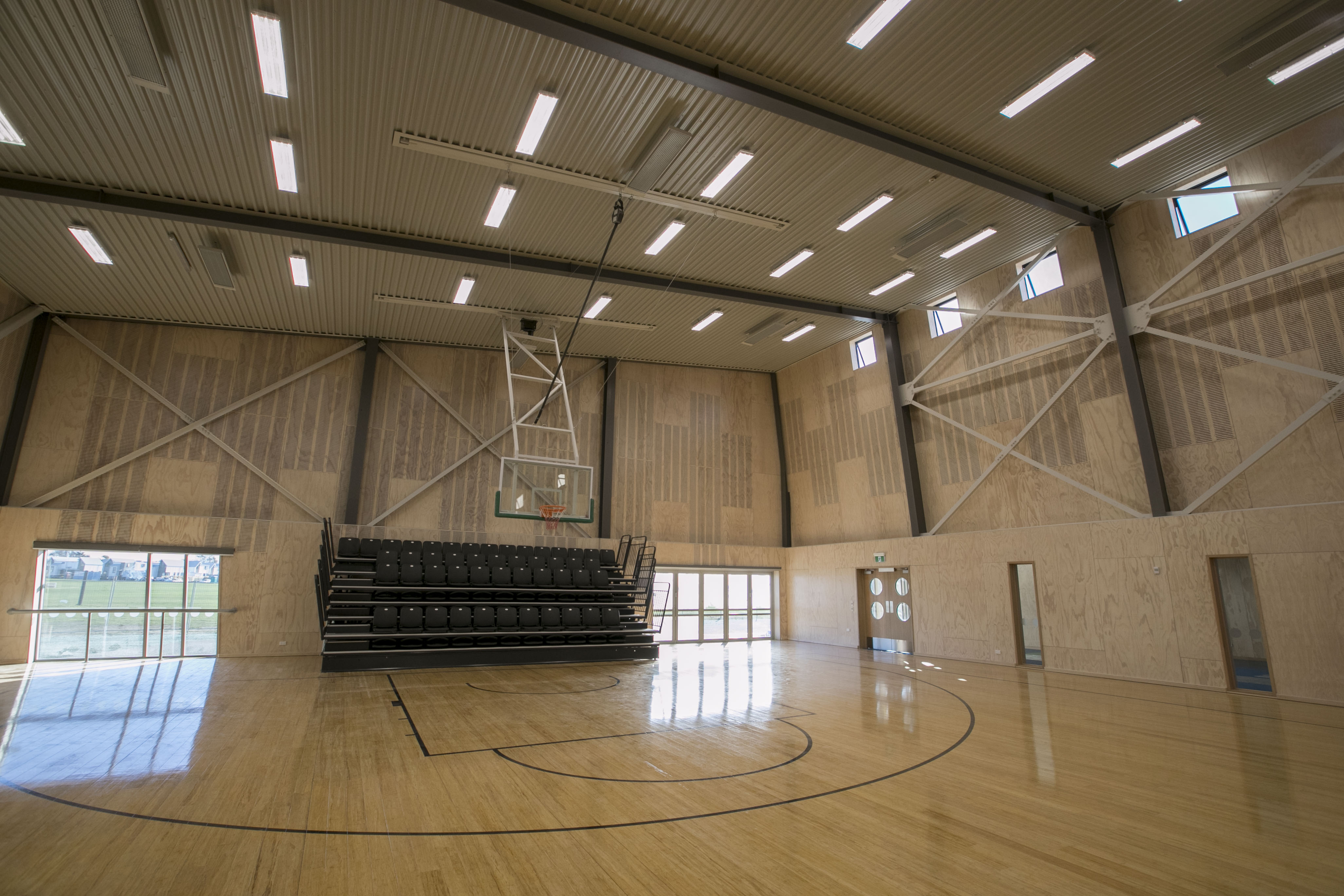 The 967 m² building includes a large sports and function hall with retractable seating, indoor and outdoor stages, two meeting rooms, office spaces, and a commercial kitchen. Its design incorporates features such as decorative precast panels, ribbed steel cladding, and a portal steel structure that allows flexible open plan use. The hall is finished with a bamboo sprung floor, making it suitable for a range of sporting activities.